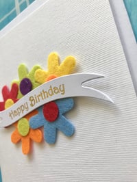 Five felt flowers bunched together with a Happy Birthday banner across them.