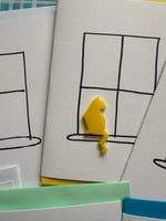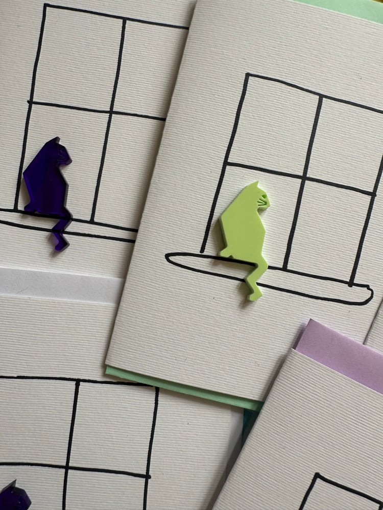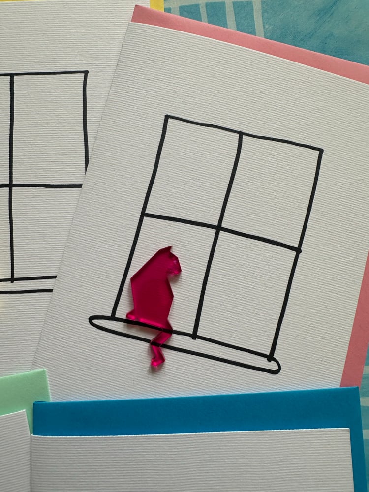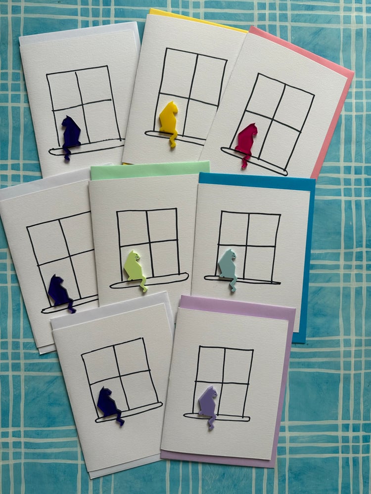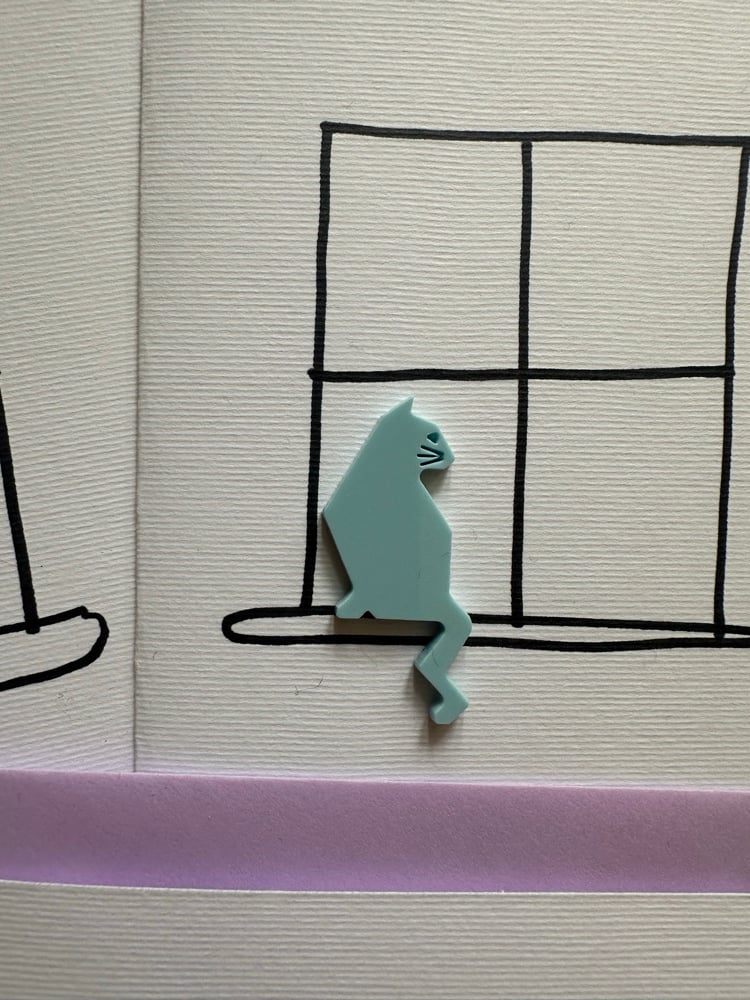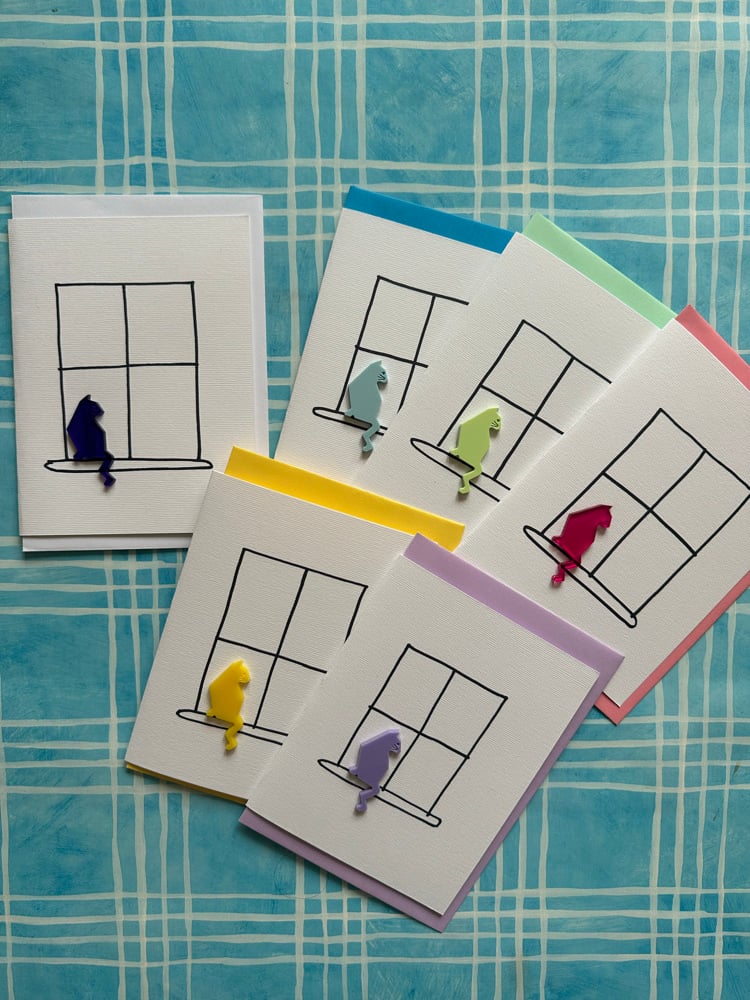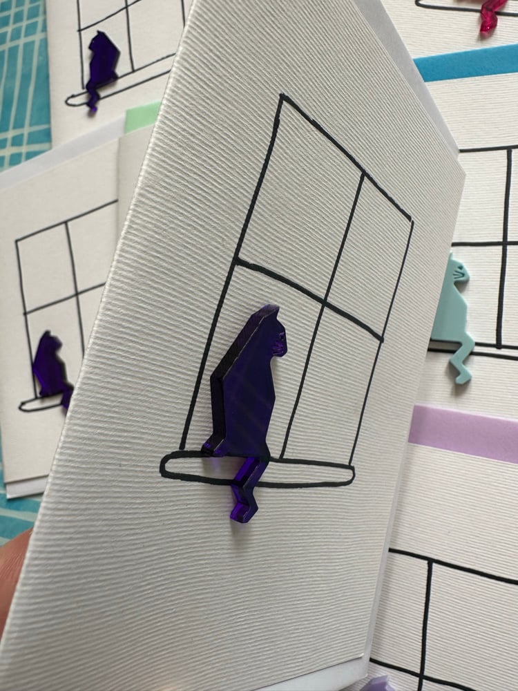 Acrylic cut cat sitting at the window. I have hand drawn the window on all these cards so the window is slightly different in them all-the beauty of a true handmade greetings card.