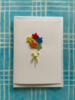 Wooden colourful flower heads, hand drawn silver ink stems, lemon bow
