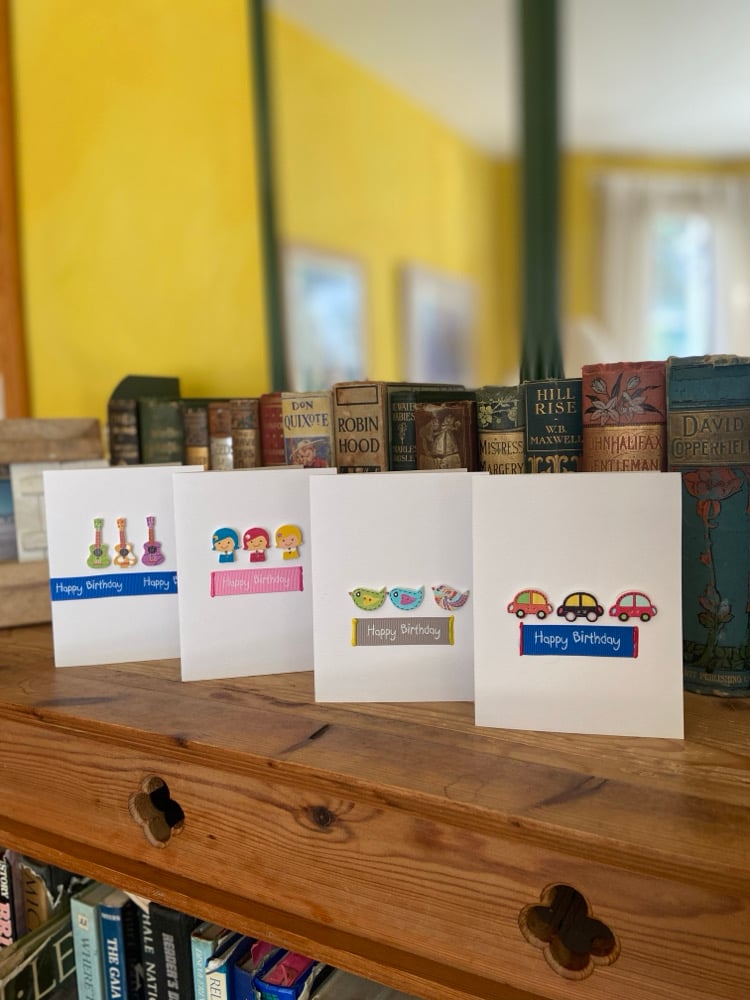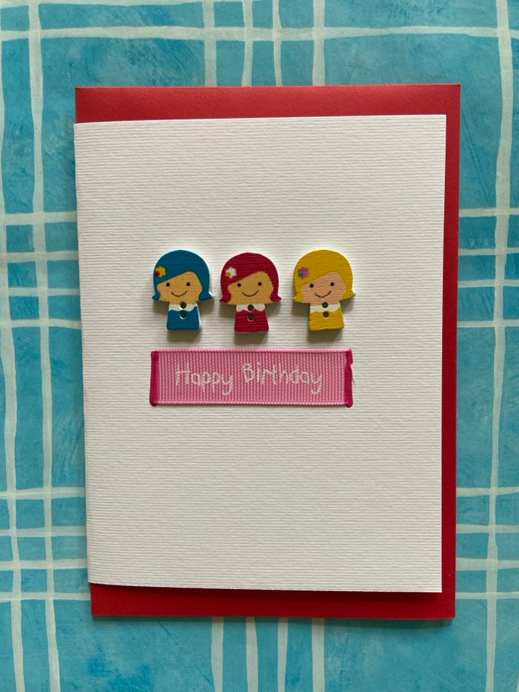 Three small wooden buttons with a Happy Birthday fabric banner underneath.